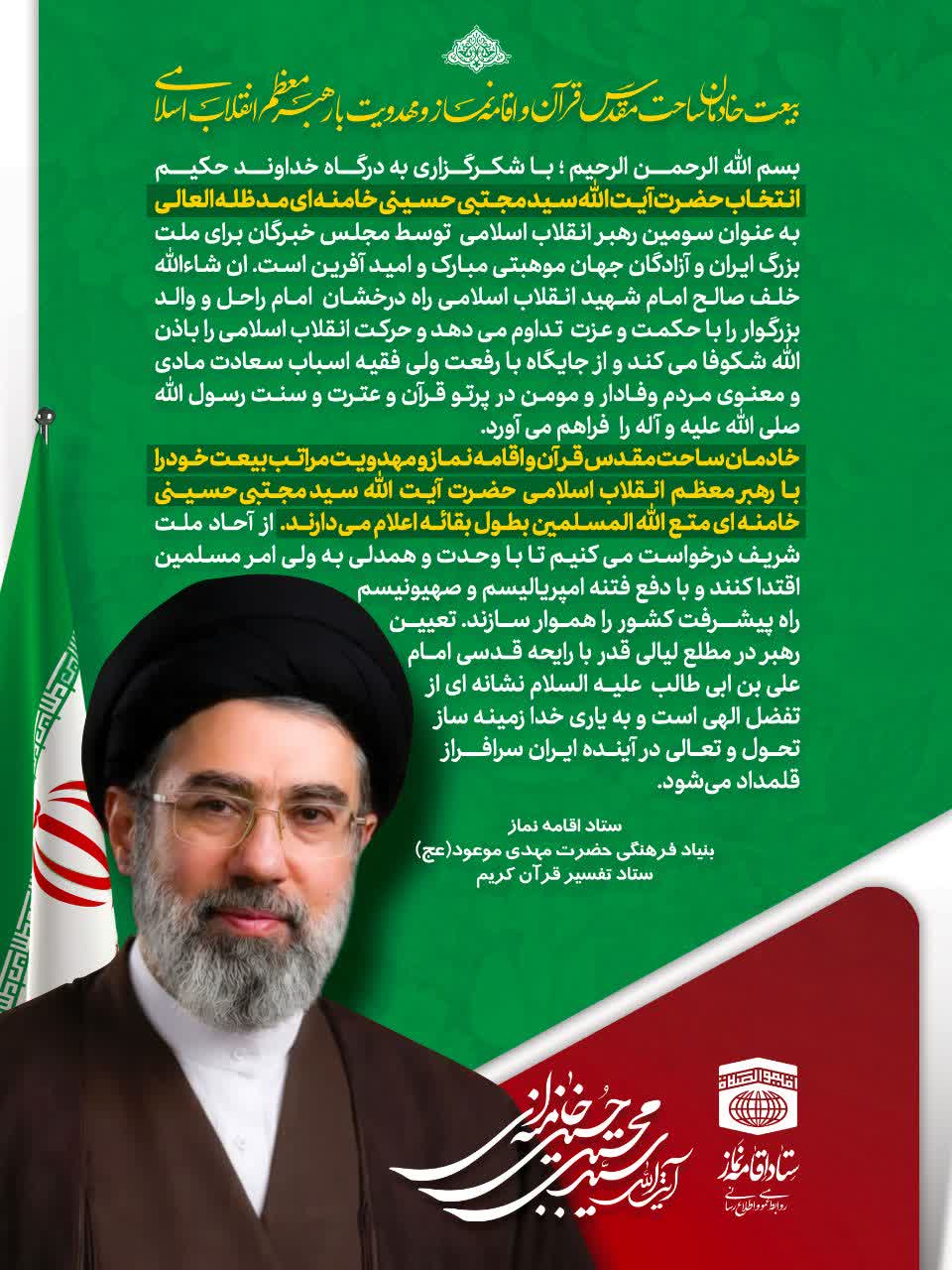 خادمان ساحت مقدس قرآن و اقامه نماز و مهدویت مراتب بیعت خود را با رهبر معظم انقلاب اسلامی حضرت آیت الله سیدمجتبی حسینی خامنه ای متع الله المسلمین بطول بقائه اعلام می دارند. از آحاد ملت شریف درخواست می کنیم تا با وحدت و همدلی به ولی امر مسلمین اقتدا کنند و با دفع فتنه امپریالیسم و صهیونیسم راه پیشرفت کشور را هموار سازند. تعیین رهبر در مطلع لیالی قدر با رایحه قدسی امام علی بن ابی طالب علیه السلام نشانه ای از تفضل الهی است و به یاری خدا زمینه ساز تحول و تعالی در آینده ایران سرافراز قلمداد میشود.